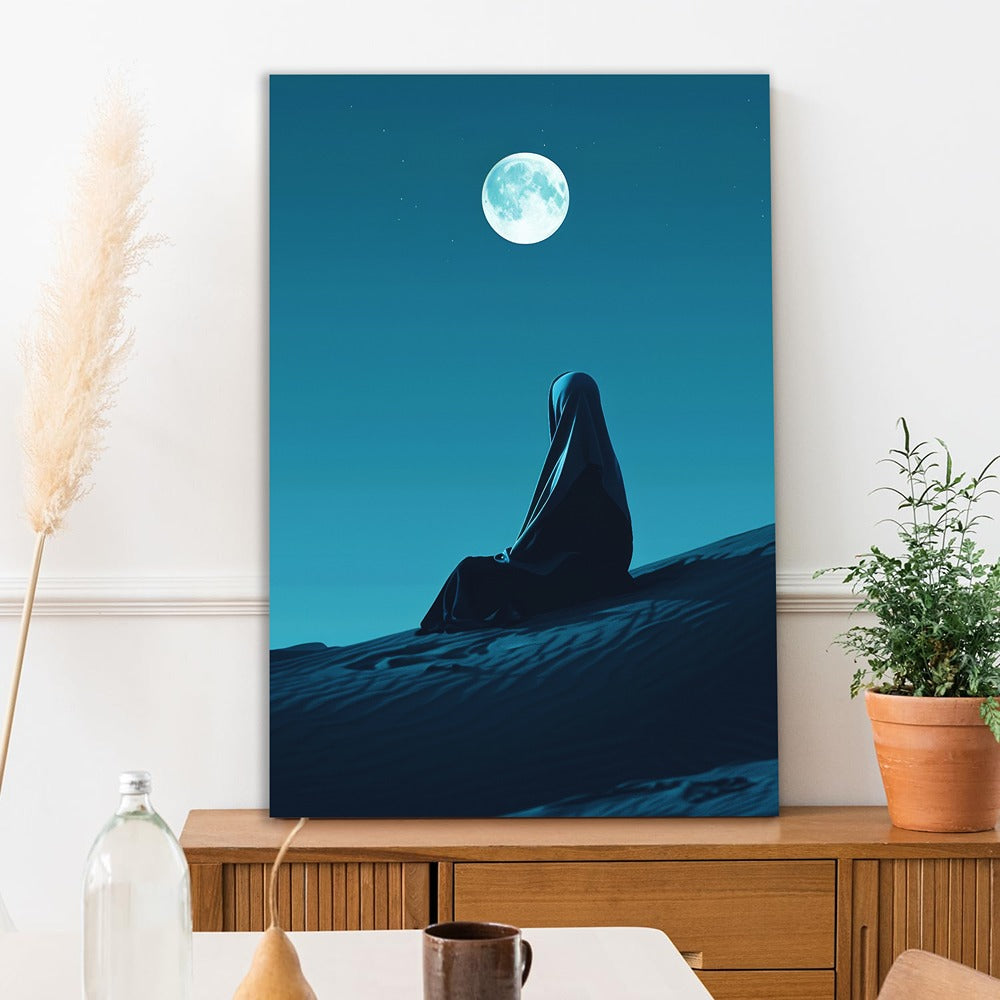 Canvas Painting Lady sitting on desert Silent Night Veiled Figure Lady Under the Full Moon Desert for Wall Decoration Elegant Stretched Wall Paintings