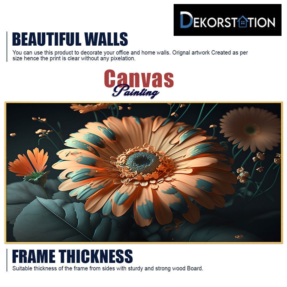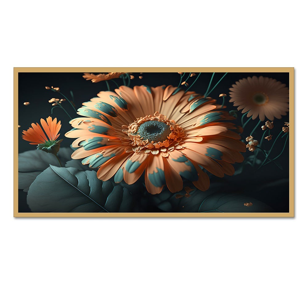 Ethereal Bloom Peach Flower and green leaf Vibrant Blue and Orange Floral Canvas Art Elegant Floating Frame Wall Paintings