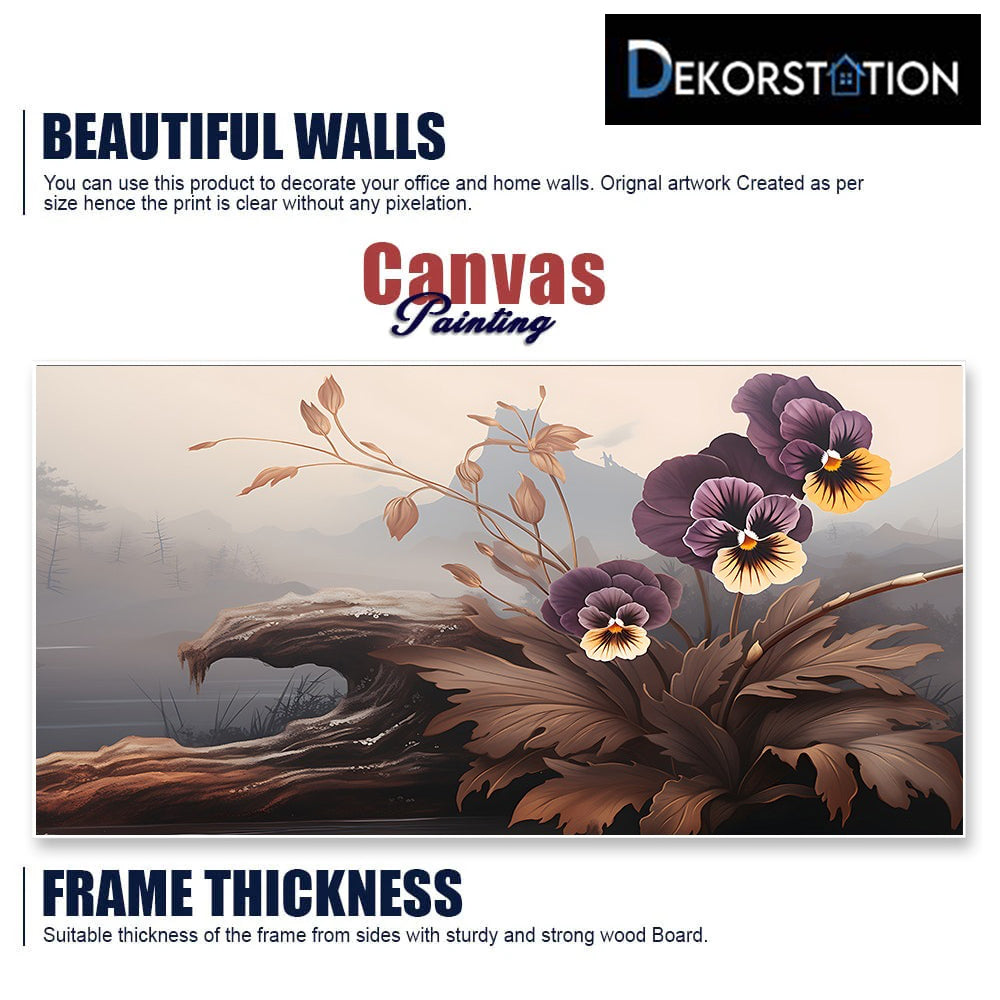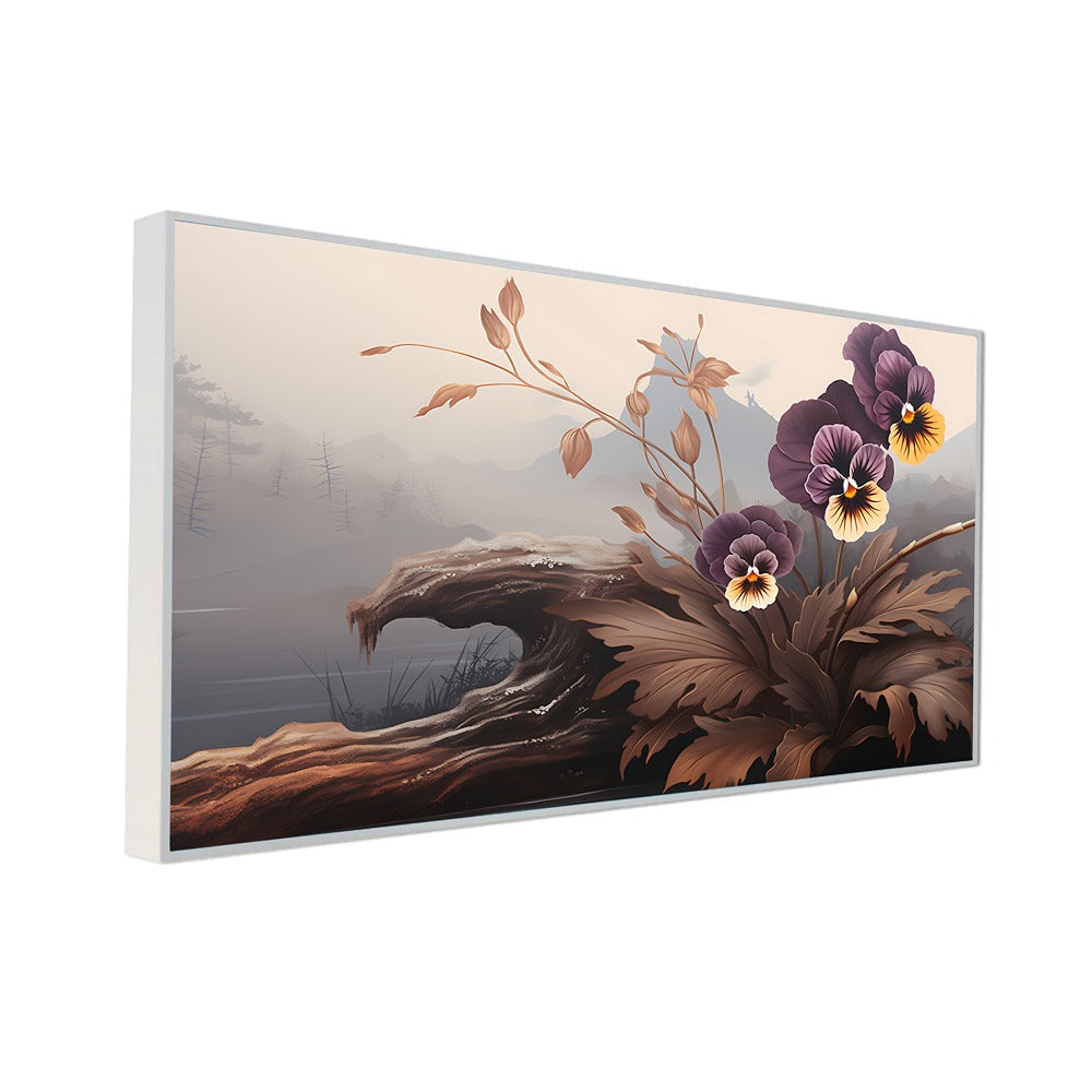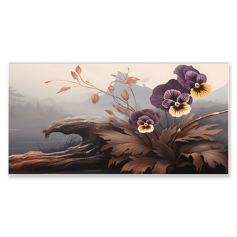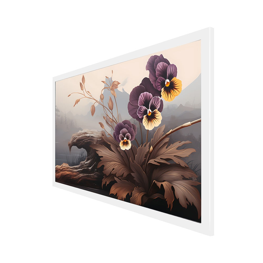 Moody Floral Landscape with Pansies and Misty Mountains canvas painting